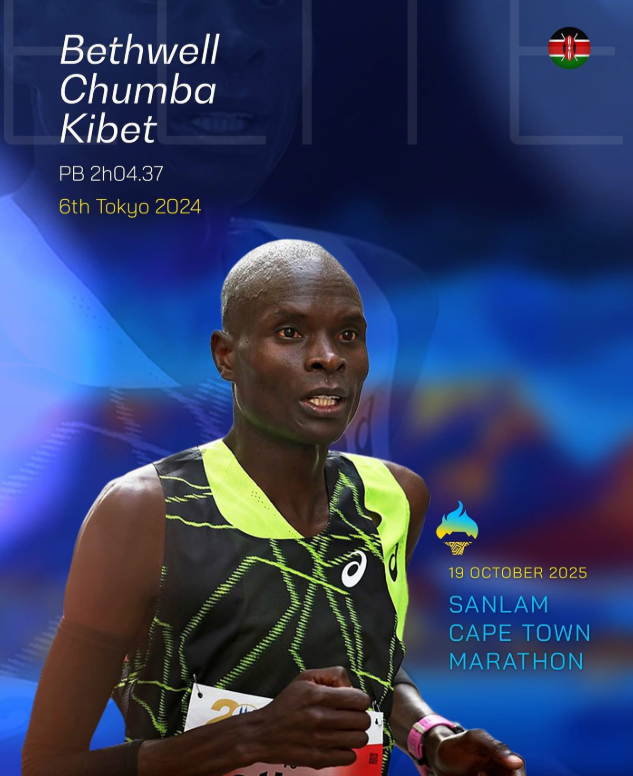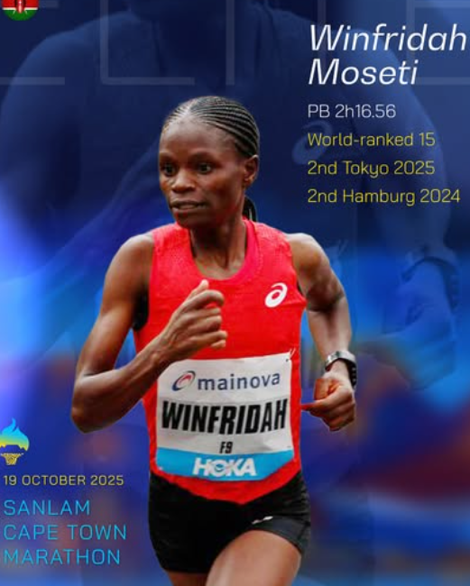 - Winfridah Moseti (Kenya), who placed a close second in this year’s Tokyo Marathon in 2:16:56 and who looks more than capable of taking the Cape Town Marathon record into sub 2 hr 20 min territory;